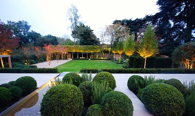 This is the same garden, taken from a slightly different angle, and just as dusk is falling. This image shows how lighting can accentuate the repetition and bring a garden to life at night so that it can be enjoyed beyond shortened autumn and winter daylight hours. It also highlights the echo of the straight lines of the hard landscaping with the straight trunks of the pleached trees and the trees on the right of the image.