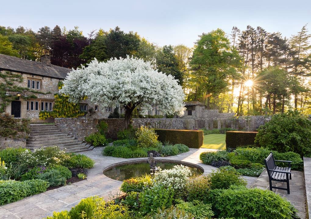 In this garden the large rounded and domed cherry tree is replicated in the shape of the pond (image 1) and the stone arch (image 2).